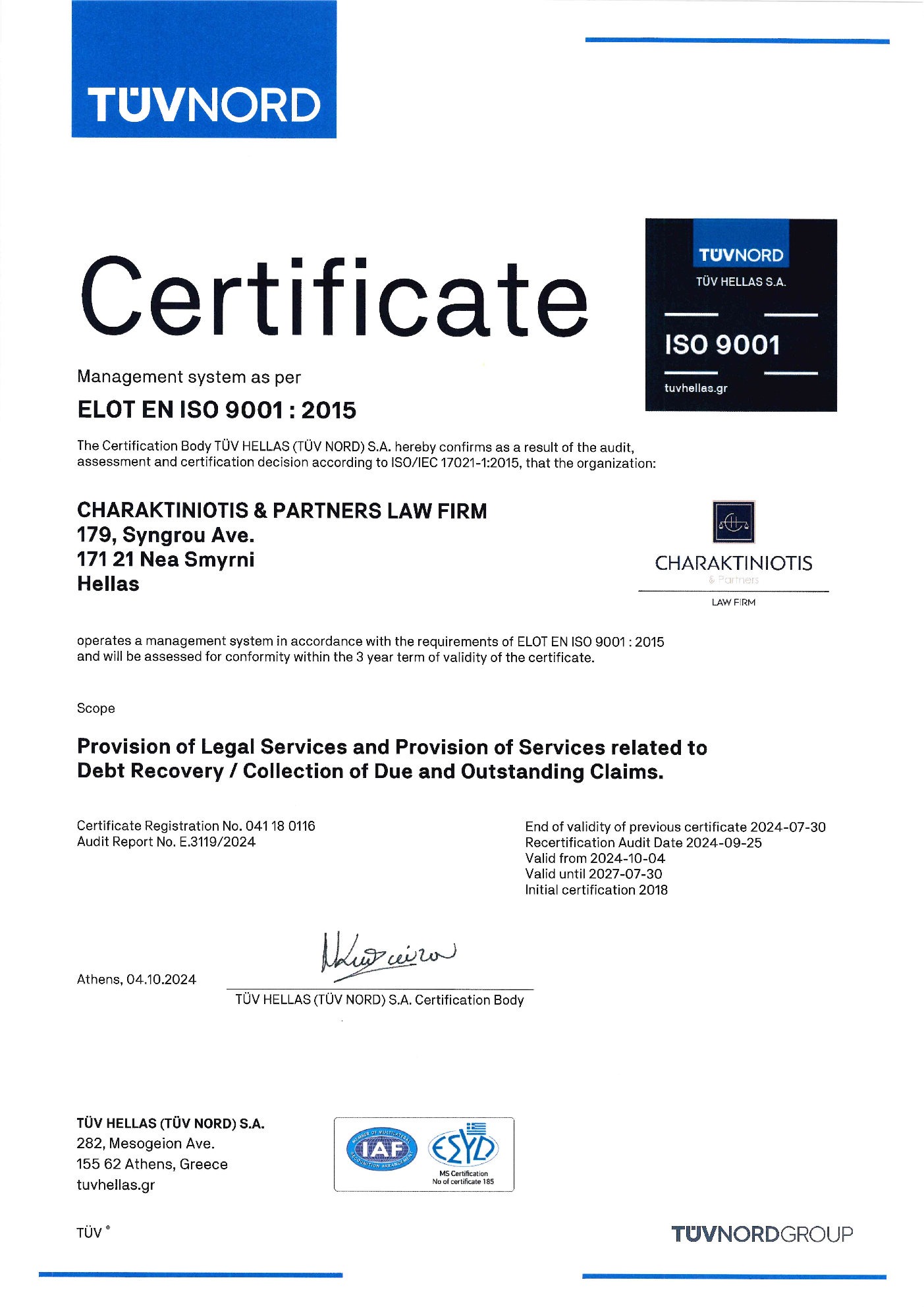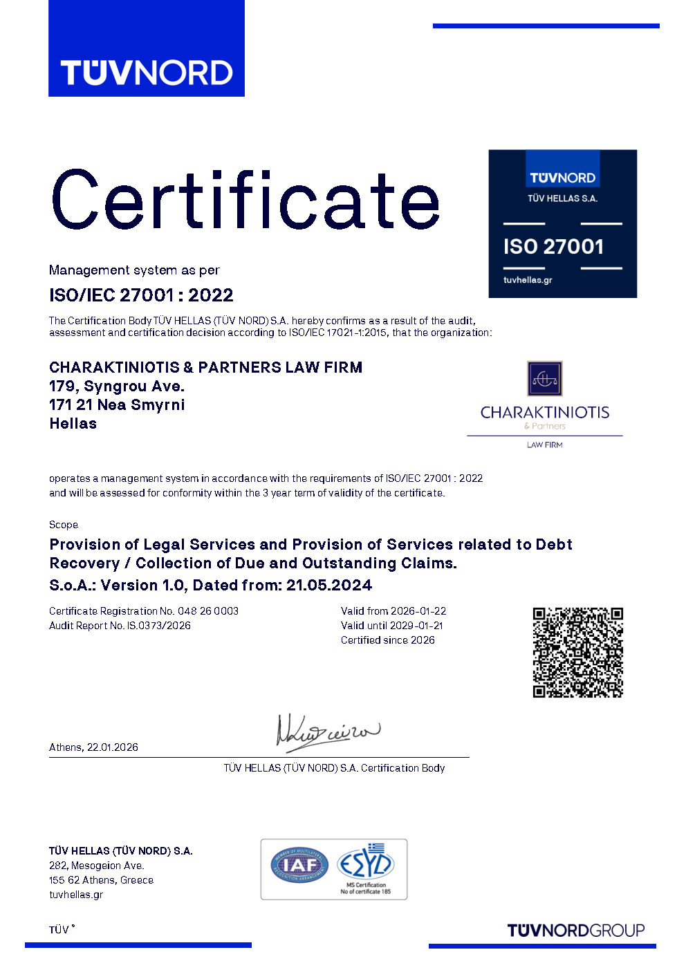 “Charaktiniotis & Partners Law Firm” aims to provide high quality services. The capability, the knowledge and the experience of its staff, its infrastructure and the standards of its information systems are the factors that led to ISO 9001:2015 and ISO/IEC 27001:2022 Quality Management Certification for Legal and Debt Management Services (Certificate Number 041 18 0116 and 048 26 0003) from TUV HELLAS.